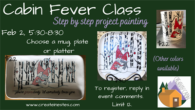We are going to paint a gnome and snowman in snowy aspen trees on your choice of a small platter ($22), large mug ($22), or squircle plate (a what?!...a plate that is square with circle corners...$30). Bring a snack or beverage of your choice if desired (wine glasses available) and a mask and we will provide the rest. Step by step painting instructions, patterns, supplies, glazing and firing included in the single price per item above.