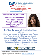 League of Women Voters of Estes Park presents a Zoom Coffee with Dr. Nicki Gonazales, How much do you know-about the history of the First Peoples and the Spanish and Mexican peoples who settled Colorado?